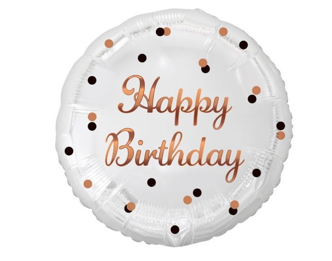 Pokryty w całości kropeczkami oraz napisem "Happy Birthday 30", na okrągłe czterdzieste urodziny.