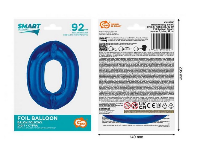 Balon foliowy cyfra „0” niebieska 92cm CH-S9N0 Godan