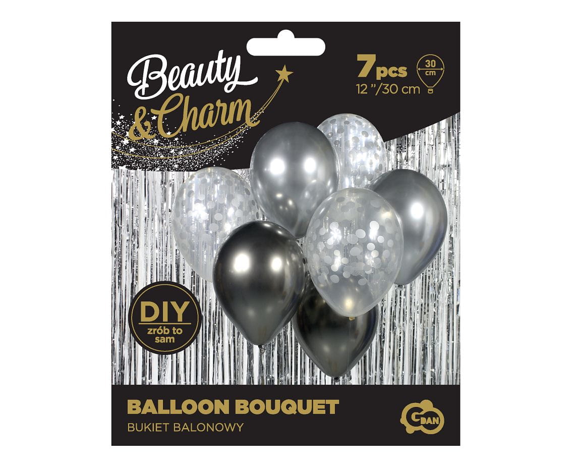 Bukiet balonowy Beauty&Charm w kolorze srebrno-grafitowym. Zrób piękny bukiet z balonów i twórz szampańskie dekoracje na imprezę, sylwestra, wieczór panieński, wesele lub podaruj w prezencie!