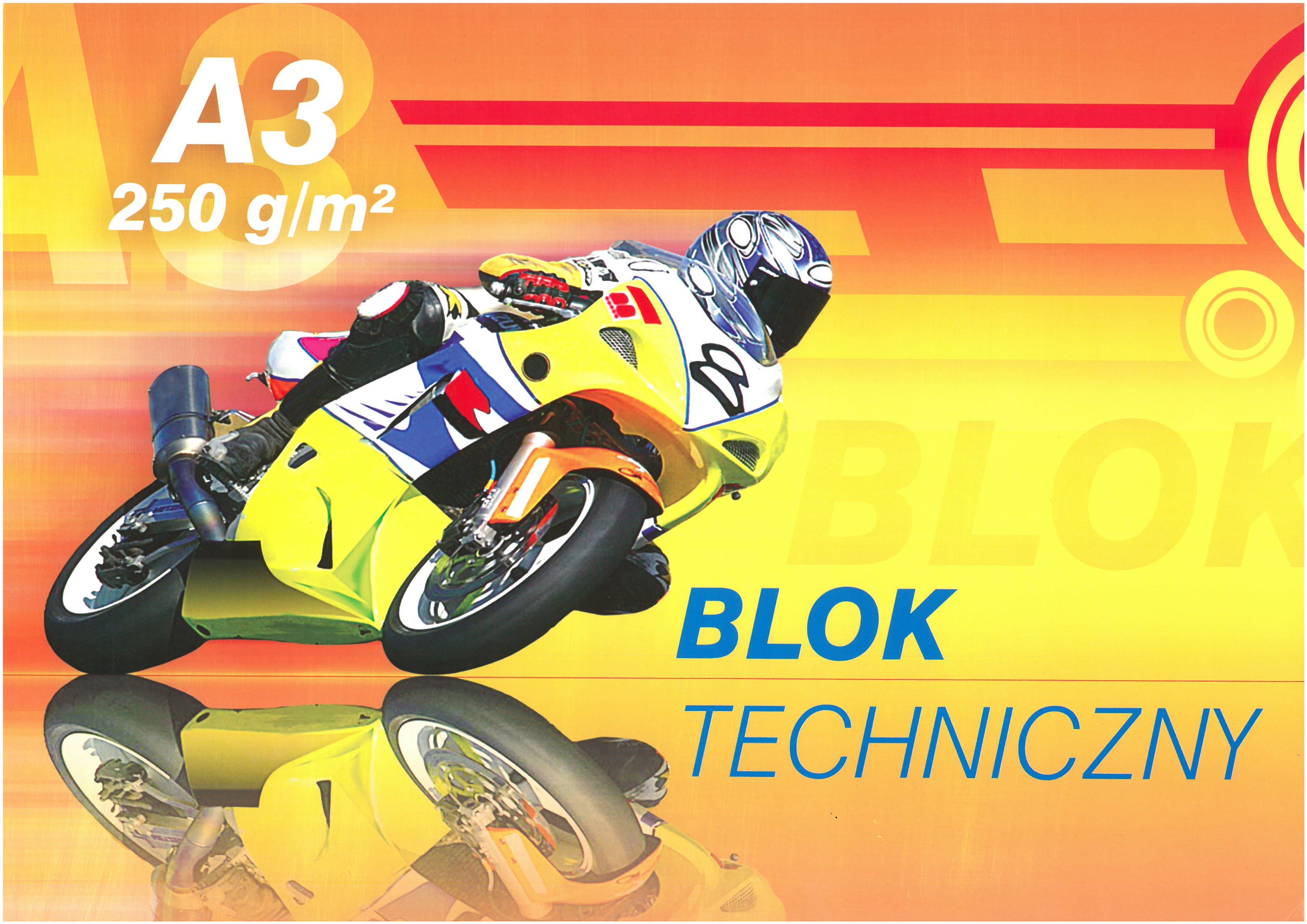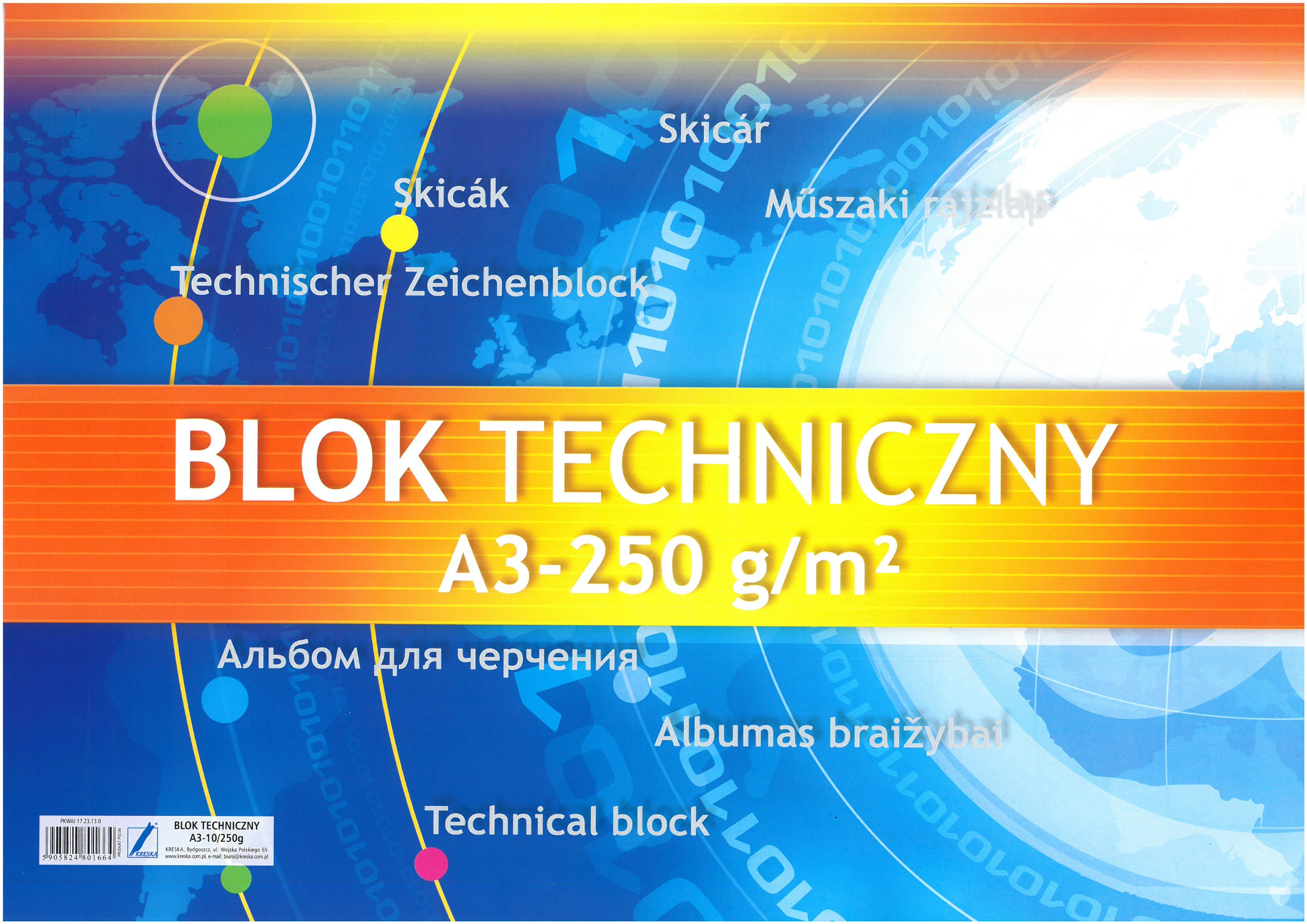 Blok techniczny A3 z białymi kartkami. Blok do kredek, ołówka, węgla, sepii i tuszu. Blok zawiera 10 arkuszy papieru o gramaturze 240g/m2 ( zdjęcie pokazuje mniejszą gramaturę , teraz jest 250g/m2 ). Rozmiar bloku A3 . Okładka występuje w 2-óch szatach graficznych ( kolor losujemy ).