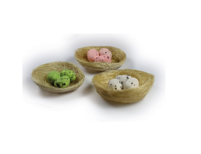 Sizalowe gniazdka z jajkami styropianowymi nakrapianymi. W opakowaniu znajdują się 3 gniazda o średnicy około 75 mm, wysokości około 20 mm.