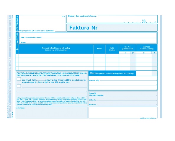 Faktura A5 198-3E Czynności Zwolnione z Podatku MP