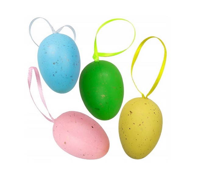 Plastikowe jajka dekoracyjne w pastelowych kolorach: niebieskim, zielonym, różowym i żółtym z nakrapianym wykończeniem.