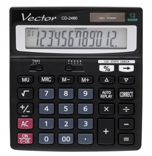 Kalkulator Vector CD-2460 12 pozycyjny. Podwójne zasilanie. Funkcja check&correct. Obliczanie marży. Zaokrąglanie wyników. Klawisz cofania. Wymiary: 150x138x35mm.