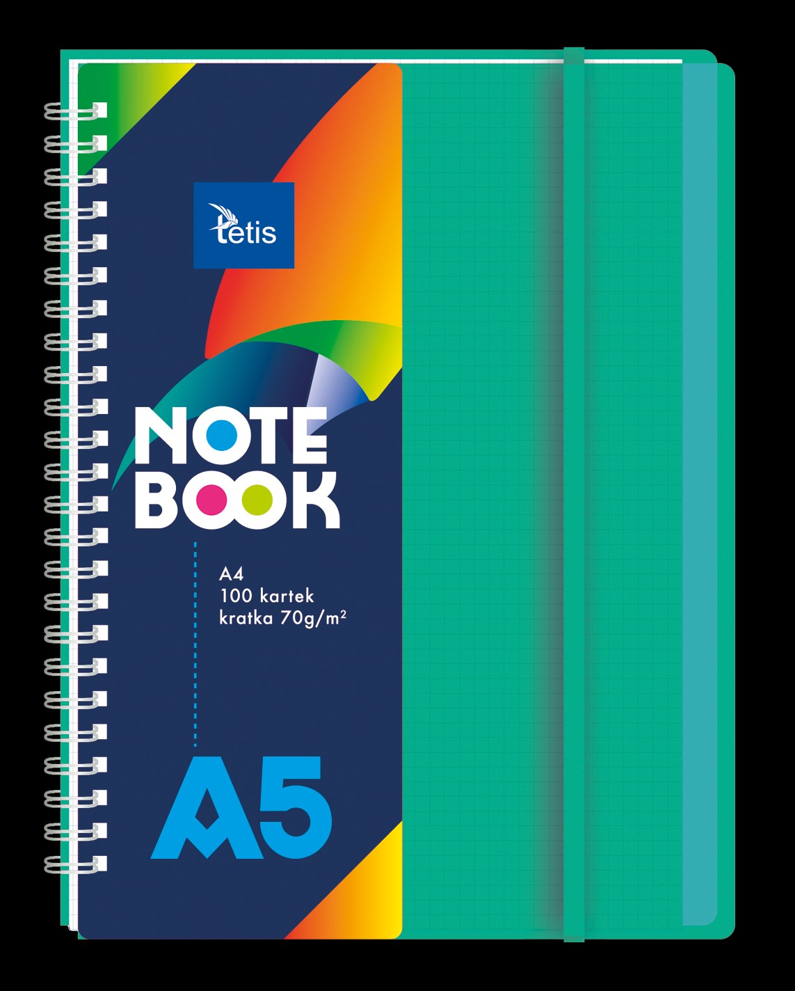 Kołonotatnik w oprawie PP. Posiada plastikowe transparentne przekładki (5 sztuk) i gumkę dopasowaną do koloru okładki. Kartki posiadają mikroperforację ułatwiającą odrywanie.