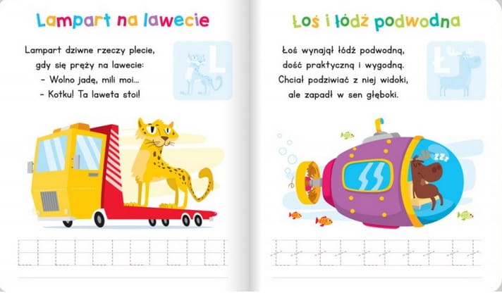 I taki sposób nauki proponujemy w tej książce: dziecko wodzi paluszkiem po kształtach liter, przykleja naklejki, a zabawne wierszyki o zwierzętach pomogą mu zapamiętać poznawane literki.