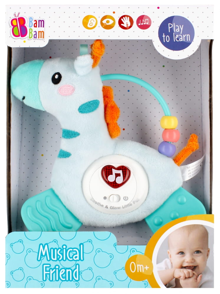 Interaktywna Muzyczna Żyrafka to zabawka spełniająca aż 4 funkcję- przywieszki, maskotki, gryzaka oraz pozytywki, na każdy etap rozwoju dziecka. Zróżnicowana faktura i materiały, w tym ruchome elementy oraz mrugające przyciski, wygrywające melodie, dostarczają szeregu bodźców, aktywizując wszechstronny rozwój dziecka, począwszy od zmysłów poprzez zdolności manualne, motoryczne oraz percepcję i wyobraźnię. Na półokręgu na grzbiecie zebry nawleczone są 4 kolorowe kółeczka, ktore przy potrząsaniu wydają delikatne, grzechoczące dźwięki. Dodatkowo w zestawie znajduje się okrąg, dzięki któremu można zawiesić zabawkę na ramie łóżka. Zabawka od 0 m-ca. Opakowanie zawiera 3 baterie AG13LR44.
