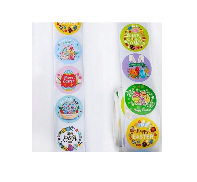 Kolorowe naklejki papierowe na rolce z motywem wielkanocnym to doskonały dodatek do dekorowania prezentów, kartek świątecznych, prac plastycznych oraz opakowań.