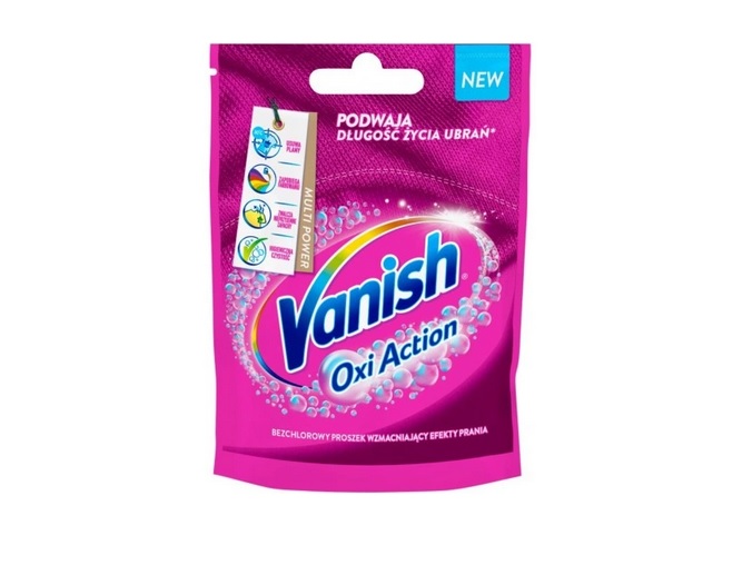 Saszetka odplamiacza w proszki marki Vanish pomaga przedłużać życie ubrań.