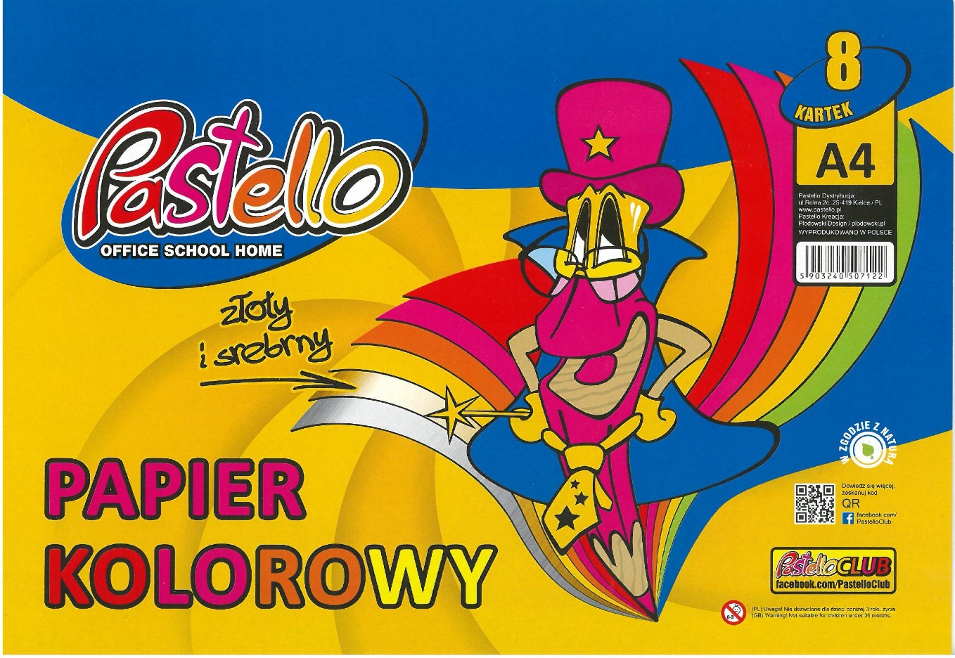 Błyszczący papier kolorowy o INTENSYWNYCH 8 kolorach: żółty, pomarańczowy, czerwony, zielony, niebieski, czarny, ZŁOTY i SREBRNY. Idealny do każdego rodzaju kleju, nie przesiąka i nie odbarwia się.