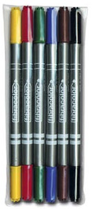 Pisaki dwustronne, zestaw 6 kolorów w etui. Dwie wytrzymałe końcówki cienka i stożkowa umożliwiają uzyskanie trzech rodzajów linii. Tusz o intensywnych czystych barwach, łatwo zmywalny z rąk i materiałów, wentylacyjne zatyczki, długotrwałe działanie.