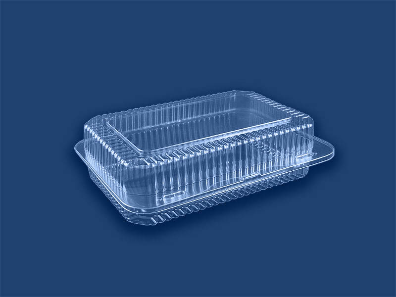 Pojemnik wykonany z przezroczystego tworzywa OPS przeznaczony, głównie do pakowania produktów cukierniczych.