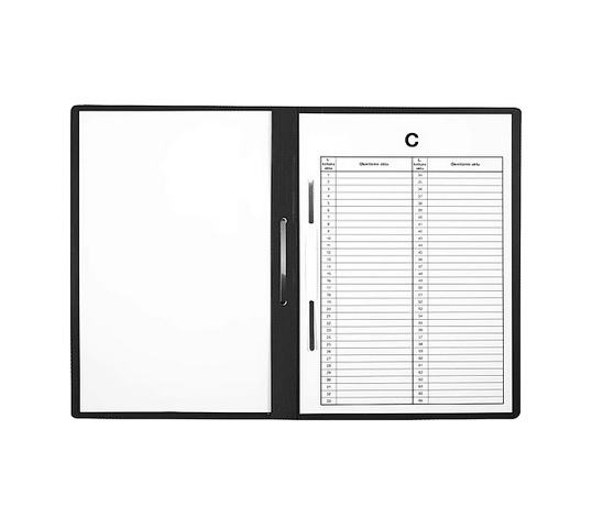Wyposażony w papierowy, wysuwany pasek do opisu akt.