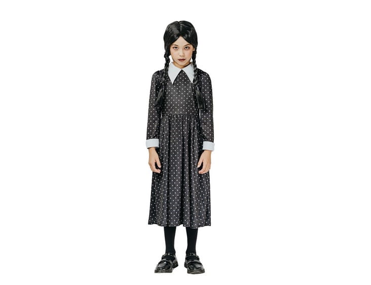 Czarna sukienka w białe groszki, z klasycznym kołnierzykiem, oddaje ducha gotyckiej elegancji z lekkim przymrużeniem oka.
