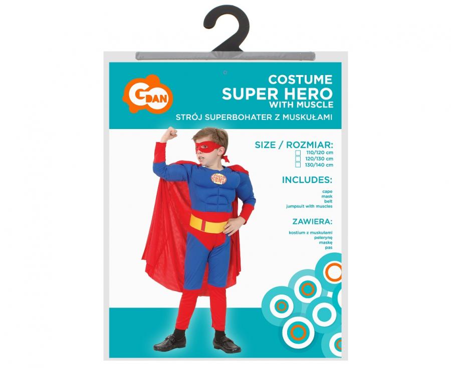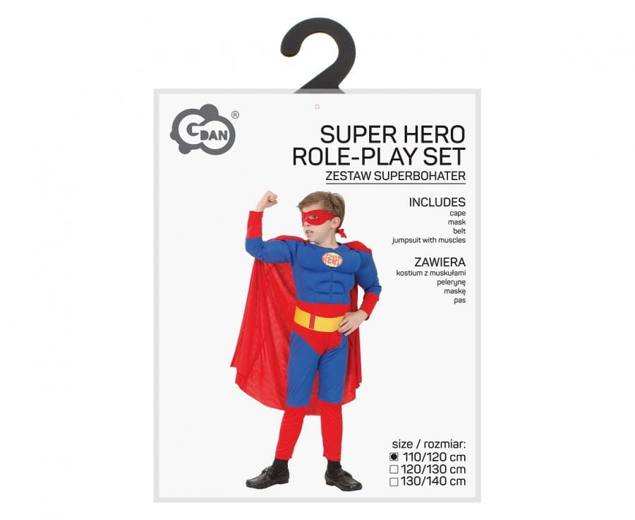 Zawiera: kostium z muskułami, peleryna, maska, pas.