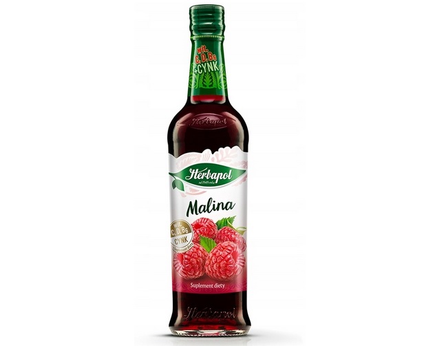 Suplement diety w postaci syropu o smaku malinowym, pasteryzowany.