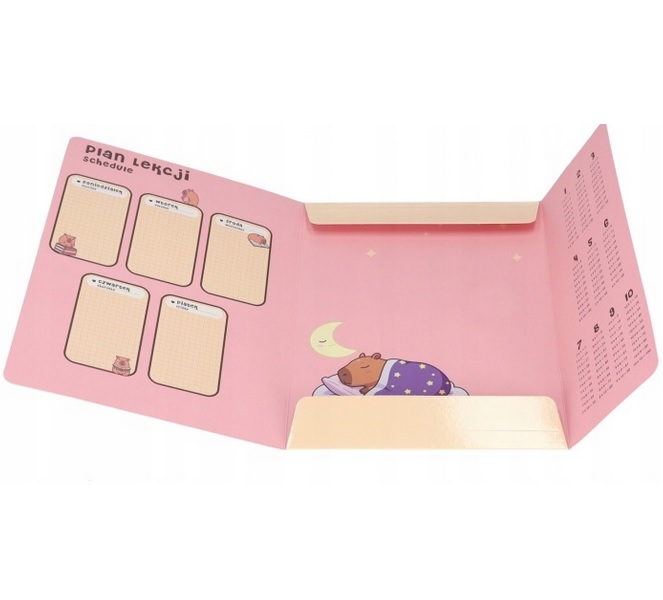 Praktyczna i stylowa teczka z gumką z uroczą grafiką kapibary to idealne rozwiązanie do przechowywania dokumentów, prac plastycznych i szkolnych materiałów.