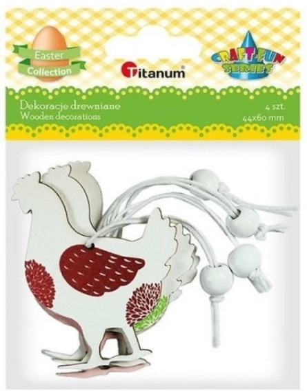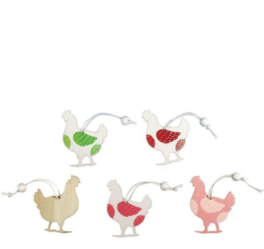 Zawieszki drewniane Wzór: kury, wymiary: 48 x 62 mm, z koralikiem 10 mm białym na sznureczku.