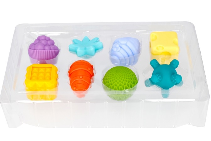 Zabawki sensoryczne o zróżnicowanych kształtach, w tym smakowitej marchewki czy muffinka, żywej kolorystyce, oraz niejednolitej fakturze są idealnie wyprofilowane dla małych rączek, łatwo je chwytać oraz trzymać.